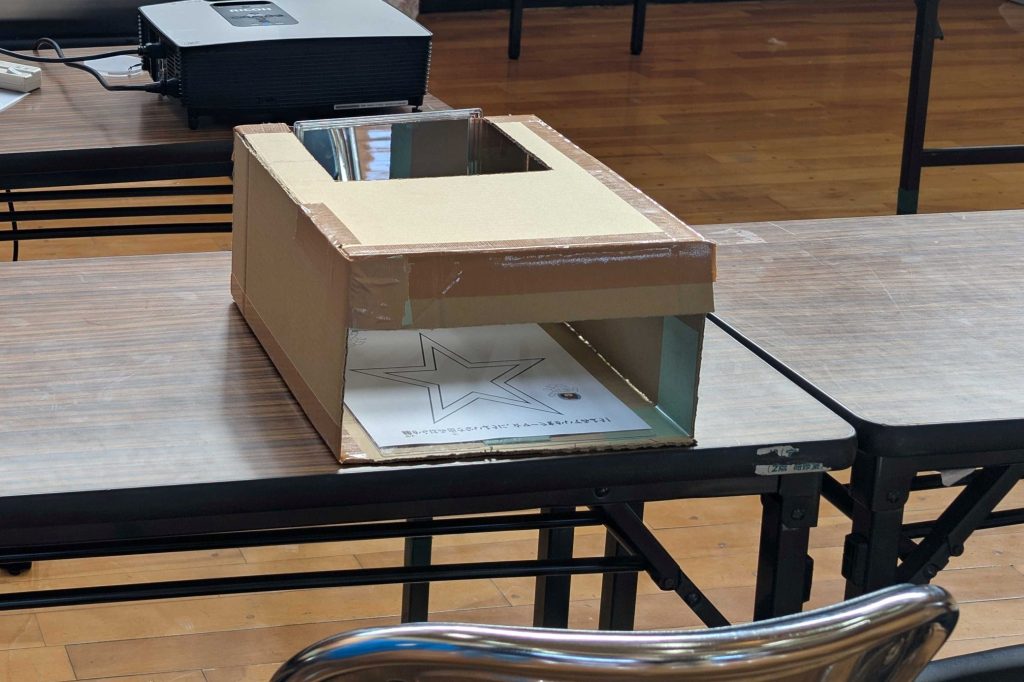 「ミラーボックス」は、上部の奥1/3と手前側面が開いており、内側の奥側面に鏡が取り付けられているボックスです。ボックス内の底には、大きい星の中に小さい星が1つ描いてある紙が置いてあり、大きい星と小さい星の間には隙間があります。子どもたちには、手前から箱の中に手を入れ、箱の上の穴から、鏡を見ながら、大小の星型の隙間に線を引いていくミッションを行ってもらいました。