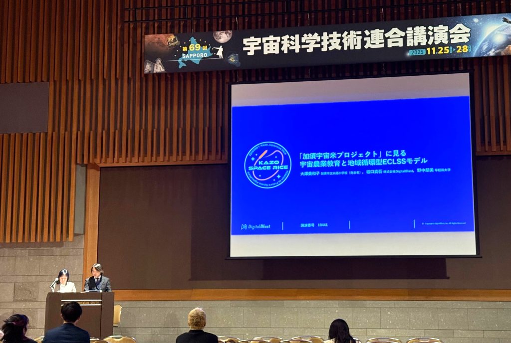 本講演会にて、当社からはCEO堀口および、赤尾、山下、石山の4名が登壇いたしました。堀口はオーガナイズドセッションにて加須市大越小学校の大澤校長と共同で「宇宙で育て、地球で味わい、学びにつなぐ:加須市発・食と農を起点とした地域循環ECLSS教育モデル」について登壇しました。